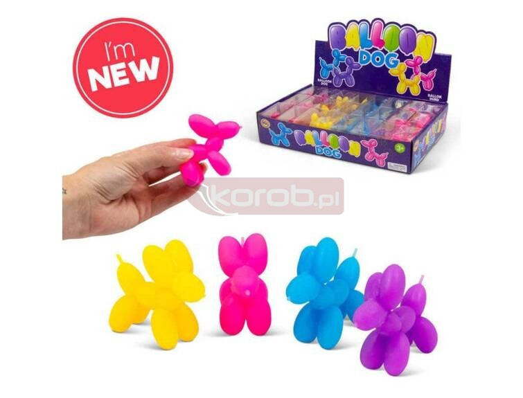Super uroczy, nowatorski pies balonowy do skręcania i fidget, dostępny w 4 kolorach, fioletowy, niebieski, różowy i żółty.