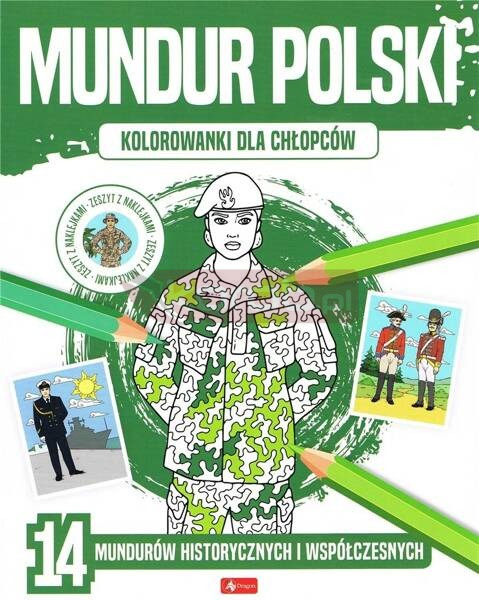 KOLOROWA HISTORIA POLSKIEGO ŻOŁNIERSKIEGO MUNDURU Oto nie lada gratka dla chłopców - czternaście kolorowanek z mundurami polskich żołnierzy. Sześć współczesnych i osiem historycznych wzorów różnych formacji, od piechoty, przez marynarkę, po lotnictwo. Współczesne mundury służbowe, galowe, polowe, wyjściowe i tropikalne, mundury kawalerzystów i marynarzy z 1939 roku, Samodzielnej Brygady Strzelców Karpackich z lat 1940-1942, odrodzonego Wojska Polskiego z lat 1944-1945, a także znane już tylko z zamierzchłych czasów, XVIII- i XIX-wieczne, bajecznie kolorowe stroje ułanów, grenadierów i woltyżerów. Kolorowanie ułatwią barwne naklejki. KREDKI W DŁOŃ I NAPRZÓD MARSZ!