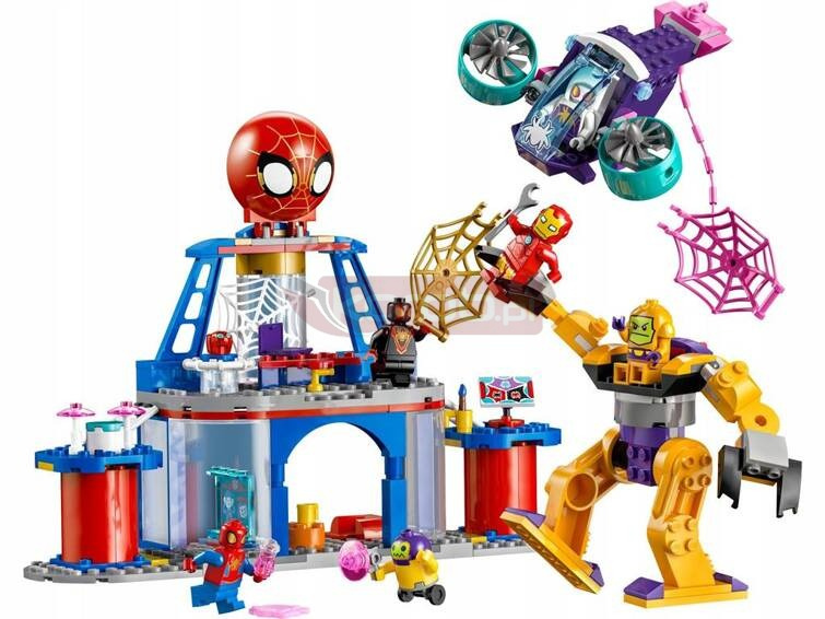 Ten zestaw z bohaterami LEGO Marvel zawiera minifigurki Spideya, Iron Mana, Milesa „Spina” Moralesa, Ghost-Spider i Zoli. W zestawie jest duży mech dla Zoli z ruchomymi nogami i pazurami, za pomocą których można chwycić minifigurkę, a także szybujący spinner z obracającymi się śmigłami, otwieranym kokpitem i dużą różową siecią. Detale w siedzibie głównej inspirują dzieci do odgrywania ról i odzwierciedlają zainteresowania superbohaterów nauką, muzyką i malarstwem.