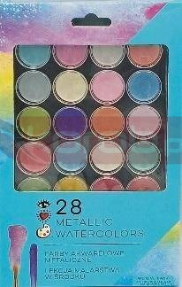 Odkryj nieograniczone możliwości zabawy kolorami i twórz własne, oryginalne obrazy. Wygodny, kompaktowy zestaw 28 farb akwarelowych w pięknych, metalicznych odcieniach każdemu użytkownikowi pozwoli wyrazić swoją kreatywność. Komplet zamknięty jest w plastikowym etui chroniącym farby przed wysychaniem i ułatwiającym ich codzienne użytkowanie. Do zestawu dołączony został pędzelek oraz krótki przewodnik po technikach akwarelowych. Dzięki niemu każdy nauczy się łączyć kolory i tworzyć nowe odcienie. Jest to idealny prezent dla dzieci, przyjaciół, dla wszystkich lubiących malować.