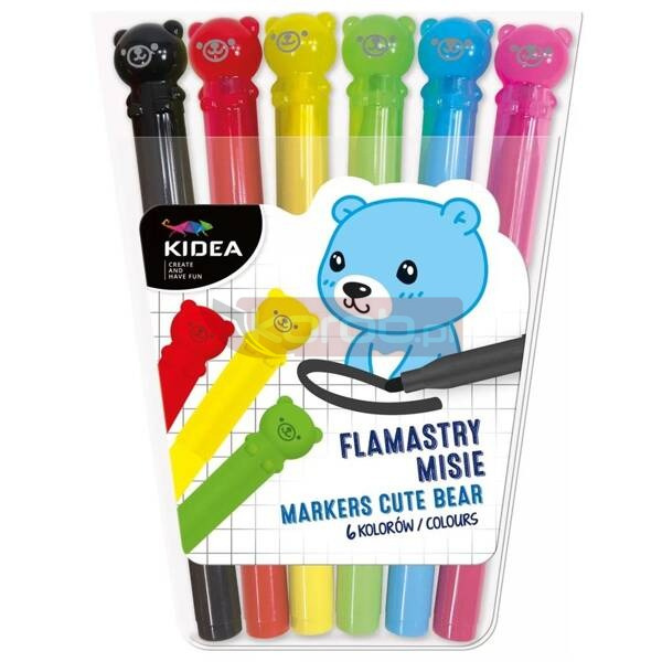 Flamastry w 6 intensywnych kolorach: żółtym, czerwonym, różowym, zielonym, niebieskim i czarnym. Zakrętki w kształcie misiów dodają flamastrom uroku, a ich zaokrąglona końcówka idealnie sprawdza się podczas rysowania, podkreślania czy pisania. Dzięki drobnym wyżłobieniom przy końcówce, flamastry są bardzo komfortowe w użytkowaniu i wygodnie leżą w dłoni.