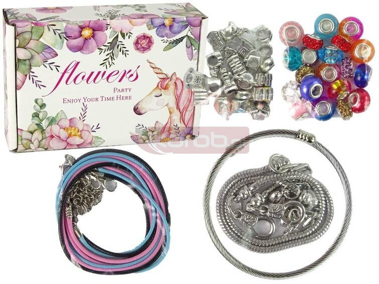 Zestaw Bransoletek, Łańcuszków oraz Kolorowych Koralików do Biżuterii Ten zestaw świetnie sprawdzi się dla dziewczynek, które uwielbiają biżuterię. Pomoże on pobudzić wyobraźnię oraz poprawi zdolności manualne. Nowa bransoletka czy naszyjnik? Nie ma problemu. Każda znajdzie coś dla siebie, a przy tym będzie się świetnie bawiła. Całość jest zapakowana w kolorowe pudełko. Zestaw zawiera: - instrukcja - zawieszki - kolorowe charmsy - 3 kolorowe wisiorki - 3 srebrne bransoletki Wymiary opakowania: 15cm x 4cm x 4cm Posiada certyfikat CE, ponadto jest zgodny z normą EN71. Zabawka przeznaczona jest dla dzieci powyżej 3 roku życia, ze względu na dużą ilość małych elementów.
