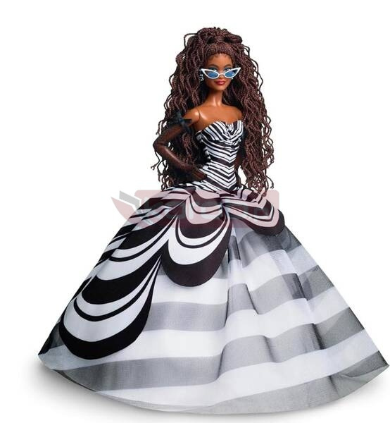 65 lat bajeczności wymaga świętowania. Nasza efektowna kreacja upamiętnia w oszałamiający sposób rocznicę debiutu lalki Barbie na nowojorskich targach zabawek. Jej czarno-biała suknia nawiązuje do jej oryginalnego kostiumu kąpielowego, a błyszczące „szafirowe” kolczyki składają hołd kamieniowi szlachetnemu związanemu z tym niezwykłym kamieniem milowym. Lalka jest obowiązkową pamiątką dla kolekcjonerów, miłośników Barbie i miłośników mody na całym świecie.