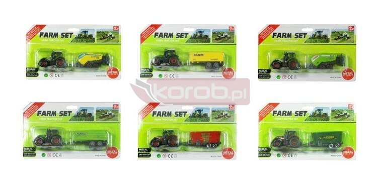 Zestaw traktor wraz z przyczepą. Posiada plastikowe i metalowe części. Produkt występuje w kilku wersjach, wybierany losowo. Cena dotyczy jednej sztuki. Produkt zapakowany w kartonową podstawkę z przezroczystym kloszem. Podane wymiary są wymiarami opakowania. Produkt dla dzieci od 3 lat.