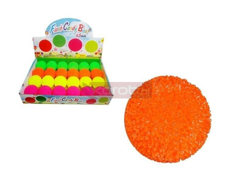 Gumowa piłeczka o nierównej, chropowatej powierzchni . Kiedy uderzy się piłką o podłoże świeci kolorowymi światełkami. Produkt występuje w kilku wersjach, wybierany losowo. Cena dotyczy jednej sztuki. Zabawka działa na baterie typu AG3. Baterie znajdują się w zabawce. #
