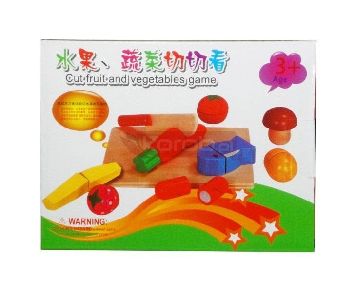 Drewniany zestaw warzyw i owoców do krojenia z deską i nożem. W zestawie m. in.: cytryna, pomidor, marchweka, truskawka, banan, ryba oraz nóż i deska. Elementy połączone są ze sobą za pomoca rzep. Produkt zapakowany w kartonowe opakowanie. Zabawka dla dzieci od 3 lat. Podane wymiary są wymiarami opakowania.