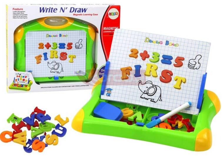 Tablica Edukacyjna Magnetyczna Literki Cyferki Pisak Gąbka Tablica edukacyjna dla dzieci to niezastąpione narzędzie wspierające rozwój intelektualny najmłodszych. Jej zielony kolor i magnetyczne płótno stwarzają doskonałe tło do twórczej ekspresji. Dzięki dołączonemu pisakowi dzieci mogą pisać, rysować i wyrażać swoje pomysły, a specjalna gąbka umożliwia łatwe wymazywanie i korektę. Ale to nie wszystko! Tablica oferuje także możliwość nauki poprzez zabawę. Do zestawu dołączone są magnesy w kształcie liter i cyfr, co umożliwia tworzenie słów, zdań i działań matematycznych. To interaktywny sposób na rozwijanie umiejętności czytania, pisania i liczenia. Dzieci mogą eksperymentować, tworzyć własne opowieści, rozwiązywać zadania i uczyć się w przyjaznej i stymulującej atmosferze. Tablica edukacyjna to nie tylko narzędzie nauki, ale także źródło niekończącej się zabawy i kreatywności. Dzieci mogą wyrażać swoje pomysły, rozwijać wyobraźnię i zdobywać nowe umiejętności w sposób przyjemny i angażujący. To idealny prezent dla każdego małego odkrywcy i ucznia, który ceni aktywne i interaktywne metody nauki. Wymiary tablicy: 30cm x 24,5cm x 3cm Wymiary opakowania: 40cm x 30cm x 4cm Posiada certyfikat CE, ponadto jest zgodny z normą EN71. Przeznaczony dla dzieci powyżej 3 roku życia.