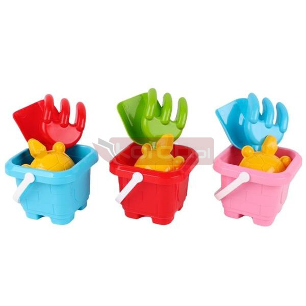 W skład zestawu wchodzi wiaderko, które pełni funkcję pojemnika na piasek. Można nim również bezproblemowo przenosić wodę i inne potrzebne materiału do budowy zamków z piasku lub innych konstrukcji. Dodatkowo, w zestawie znajduje się również foremka w kształcie żółwika oraz łopatka z grabkami, które sprawdzą się doskonale podczas zabaw w piasku.