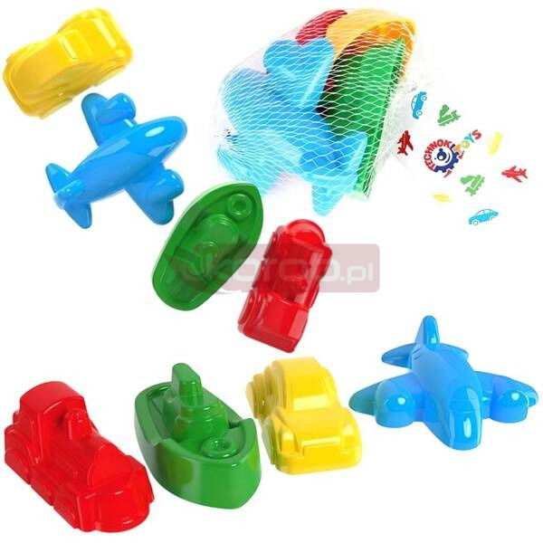 W zestawie 4 foremki w kształcie pojazdów.