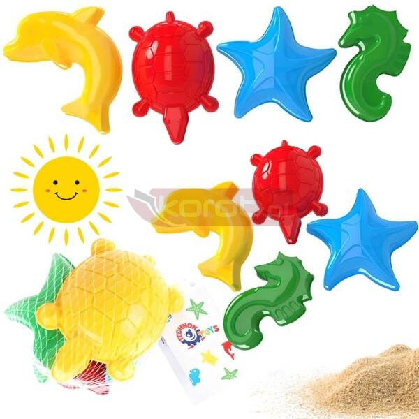 W skład zestawu wchodzą cztery różne foremki, przedstawiające popularne zwierzęta morskie: delfinka, konika morskiego, gwiazdę oraz żółwika. Każda z foremek zachwyca nie tylko kształtem, ale także pięknymi, różnorodnymi kolorami, co dodatkowo rozbudzi wyobraźnię i zmysły dziecka.