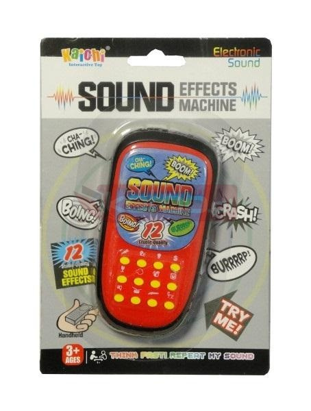 Mały telefon z 12 efektami dźwiękowymi. Dźwięki to m. in.: gwizdek, aplaus, bomba, bębenek. Zabawka działa na baterie typu AG13. Baterie znajdują się w zabawce. Produkt przeznaczony dla dzieci od 3 lat. Zabawka zapakowana w kartonową podstawkę z przezroczystym kloszem. Podane wymiary są wymiarami produktu w opakowaniu.