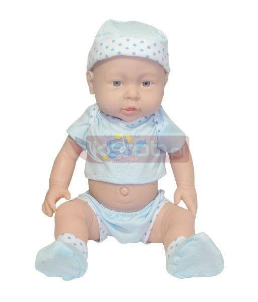 Lalka chłopiec bobas do zabawy. Lalka wydaje dźwięki m. in.: awwww..., tata, śmieje się. Produkt działa na bateria typu AG13. Baterie znajdują się w zabawce. Produkt zapakowany w przezroczysty worek. Podane wymiary sa przybliżonymi wymiarami lalki.