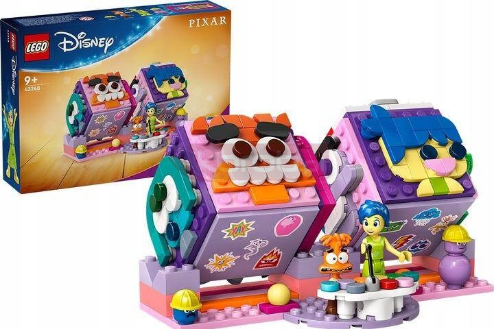 Zawiera on dwie kostki do zbudowania, każda z miejscem na drobiazgi, dziewięć płytek z emocjami, podstawkę do ekspozycji kostek, minilaleczki LEGO | Disney od Pixar Radości i Niepokoju z pasującymi kolorowymi kulami pamięci oraz Foremana i Margie – pracowników umysłu w kaskach.