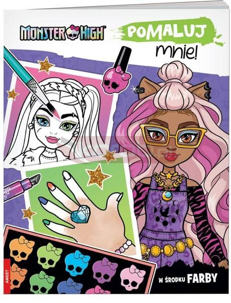 Moc kreatywnej zabawy dla małych fanek mody i makijażu! Książka zawiera gotową do użycia paletę barw. Wystarczy zamoczyć pędzelek w wodzie, wybrać odpowiednią farbkę i już można malować! Obrazki ulubionych postaci można kolorować także kredkami. Makijaże, fryzury, paznokcie, biżuteria? Każdy element wizerunku potrzebuje sprawnej ręki małej stylistki, żeby lalki Monster High wyglądały zjawiskowo.