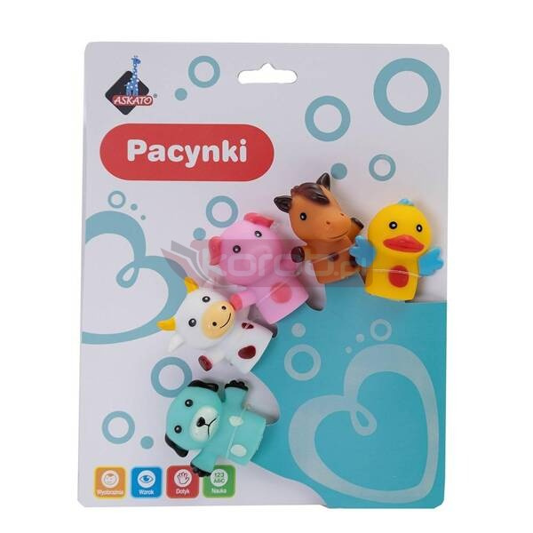 5 pacynek na palce przedstawiających różne zwierzątka Idealne do zabawy w teatrzyk, zgadywanie, jako pomoc dydaktyczna, pasują na dziecięce paluszki. Pacynka - wysokość ok. 6 cm