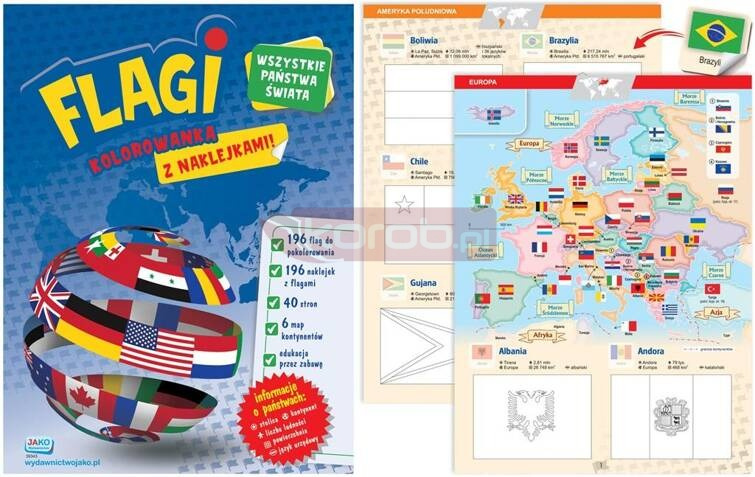 Ta edukacyjna kolorowanka w przyjazny sposób pomaga poszerzać wiedzę dzieci na temat otaczającego ich świata. Na 40 dużych stronach (240 x 322 mm) znajdują się flagi wszystkich państw, czyli 193 państw członkowskich ONZ oraz Watykanu, Palestyny i Kosowa. Dodatkowo na rozkładówce jest 196 naklejek z flagami. Naklejki te należy wkleić w odpowiednich miejscach na stronach, gdzie będą służyć jako wzorzec do kolorowania. Państwa zostały przyporządkowane do 6 kontynentów: Europy, Azji, Australii i Oceanii, Afryki, Ameryki Północnej oraz Ameryki Południowej. Dzięki zawartym mapom dzieci mogą także dowiedzieć się, gdzie znajdują się poszczególne kraje. Dodatkowo obok flagi każdego kraju są skrótowe informacje: nazwa stolicy, kontynent, na którym leży dany kraj, liczba ludności, powierzchnia oraz język urzędowy.