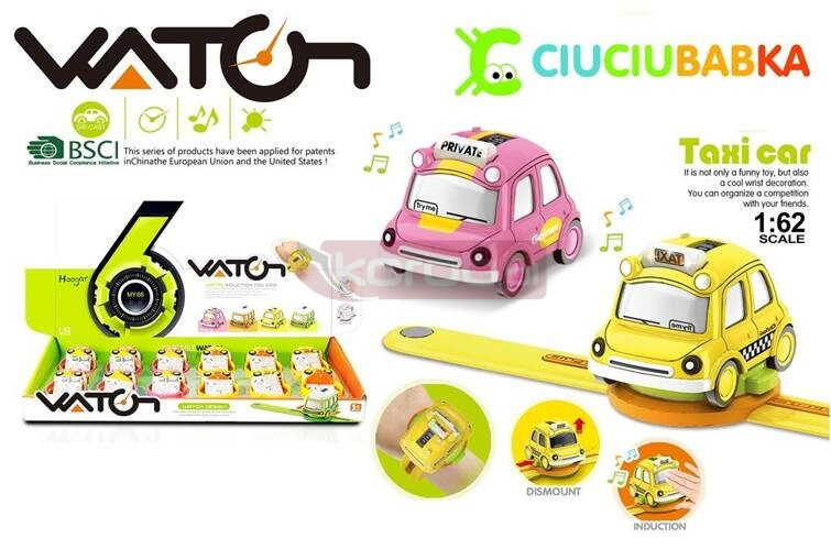 zegarek z odpinanym samochodzikiem , który gra, świeci, dodatkowo po naciśnięciu przedniej szyby uruchamia się sensor, który zmienia funkcje świetlno - dźwiękowe