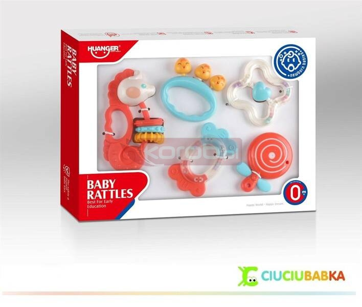 zestaw 5 grzechotek - gryzaków dla najmłodszych , elementy są wykonane z silikonu i plastiku.