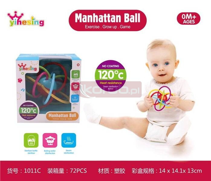 Grzechotka dla najmłodszych wykonana z plastiku i silikonu w kształcie kuli