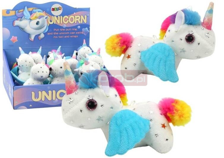Jednorożec Konik Pluszowy Naciągany Skaczący Biały Pluszowy konik jednorożec to niezwykła zabawka, która przenosi dzieci w świat bajek i marzeń, zachwycając swoim urokiem i ruchomą zabawą. Nasz konik jednorożec to nie tylko zwykły pluszak - to przyjaciel, który zawsze stoi do dyspozycji małych odkrywców. Jego niewielkie rozmiary sprawiają, że doskonale wpasowuje się w każdą małą rączkę, zapewniając wygodę i przyjemność podczas zabawy. A delikatna biała sierść z subtelnymi srebrnymi gwiazdkami, kolorowy ogonek i grzywa nadają mu niepowtarzalnego uroku, który zachwyci każde dziecko. Przypominając prawdziwego konika z krainy czarów, nasz pluszowy jednorożec posiada także urocze niebieskie skrzydełka, które dodają mu jeszcze więcej magii i fantazji. Ale to nie wszystko! Dzięki naciąganej lince, konik zaczyna radośnie podskakiwać i kręcić ogonkiem, co sprawia, że zabawa staje się jeszcze bardziej ekscytująca i pełna uśmiechu. To nie tylko zabawka - to magiczna podróż do świata wyobraźni i marzeń. Nasz konik jednorożec nie tylko bawi, ale także rozwija wyobraźnię, koordynację ruchową i zdolności motoryczne dziecka. Dzięki niemu, każda chwila staje się niezapomnianą przygodą w krainie magii i fantazji. W opakowaniu zbiorczym znajduje się 9 sztuk. Koniki sprzedawane osobno. Wymiary konika: 15cm x 12,5cm x 8cm Wymiary opakowania zbiorczego: 30,5cm x 28cm x 12cm Posiada certyfikat CE, ponadto jest zgodny z normą EN71. Przeznaczony dla dzieci powyżej 3 roku życia.