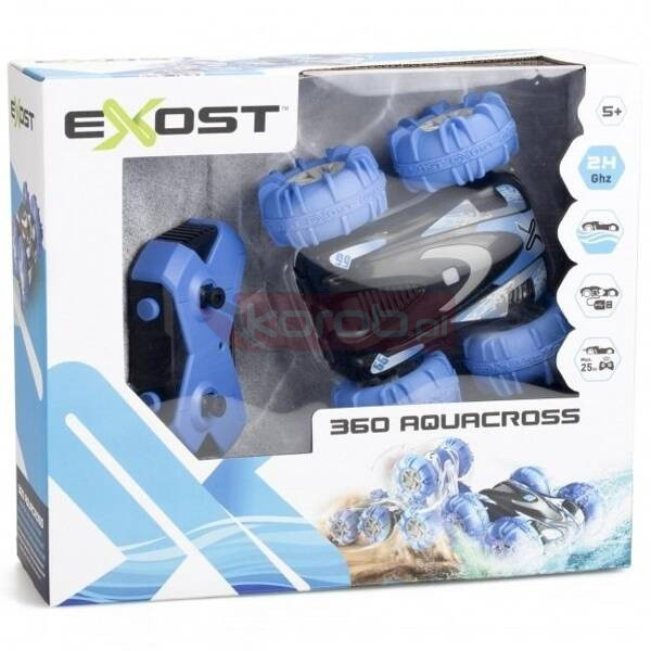 Nabierz prędkości, pokonując trasę i przecinając wodę! Pojazd AquaCross działa na częstotliwości 2,4 GHz, a steruje się nim za pomocą dołączonego do zestawu pilota. Samochód potrafi jeździć po wodzie oraz po lądzie, poruszając się przy tym we wszystkich kierunkach. Potężne opony ułatwiają mu pokonywanie niewielkich przeszkód, a przejeżdżając przez nie AquaCross obraca się o 360 stopni zmieniając swój wygląd! Wszystko za sprawą dwustronnego korpusu, którego górna i dolna część różnią się kolorem. Dzięki temu w jednej chwili możesz przekształcić auto w zupełnie nowy pojazd!