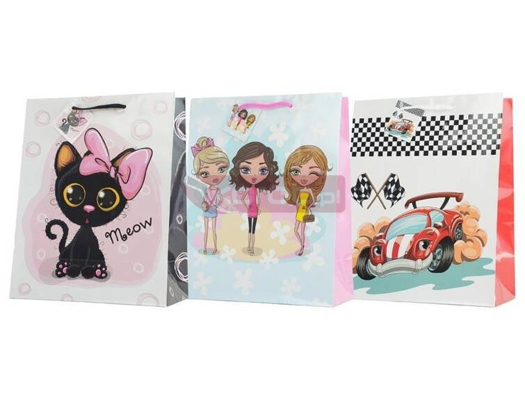 Torebka papierowa z nadrukiem. Torebka ma mocny uchwyt oraz zawieszkę. Wymiar: 330mm x 455mm x 100mm (szer. x wys. x gł.)