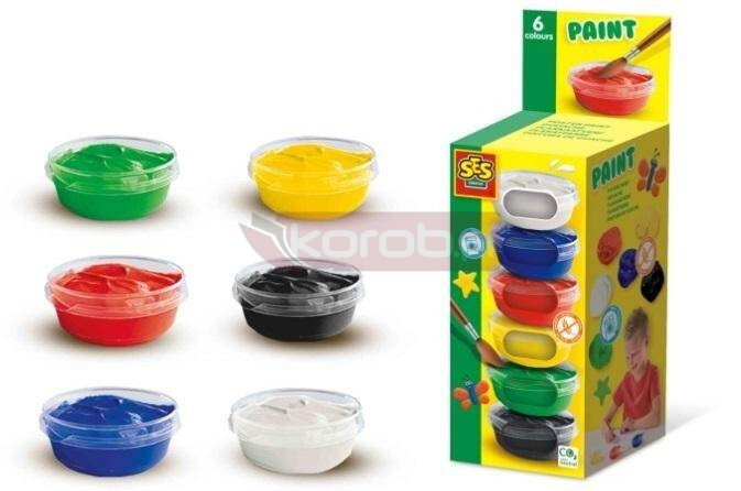 Zestaw farb plakatowych składa się z sześciu kolorów: czerwonego, niebieskiego, białego, czarnego, zielonego i żółtego.