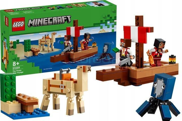 Zestaw LEGO Minecraft Rejs statkiem pirackim zawiera pojazd do zbudowania, figurki kałamarnicy, wielbłąda i dwóch piratów oraz akcesoria.