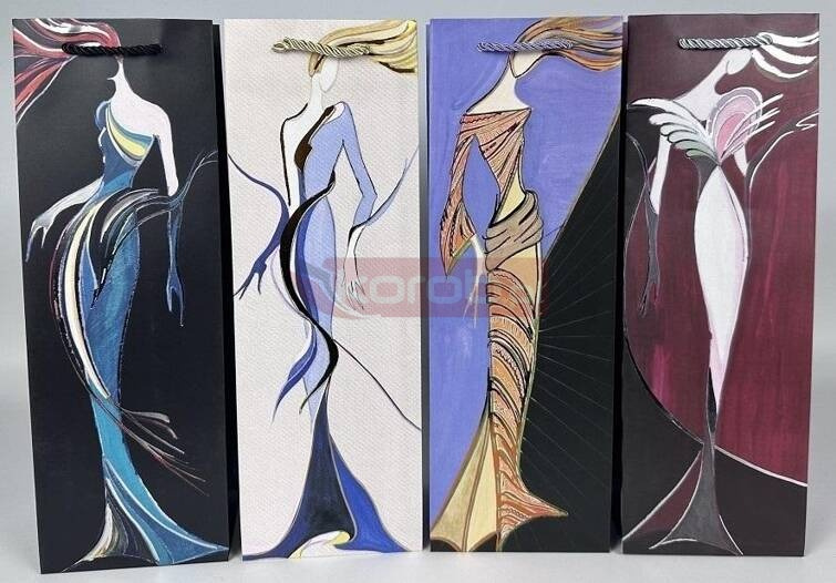 Torebka prezentowa na butelkę Premium. Materiał karton 210 gr. Brokatowe elementy ozdobne. Uchwyt ze sznurka.
