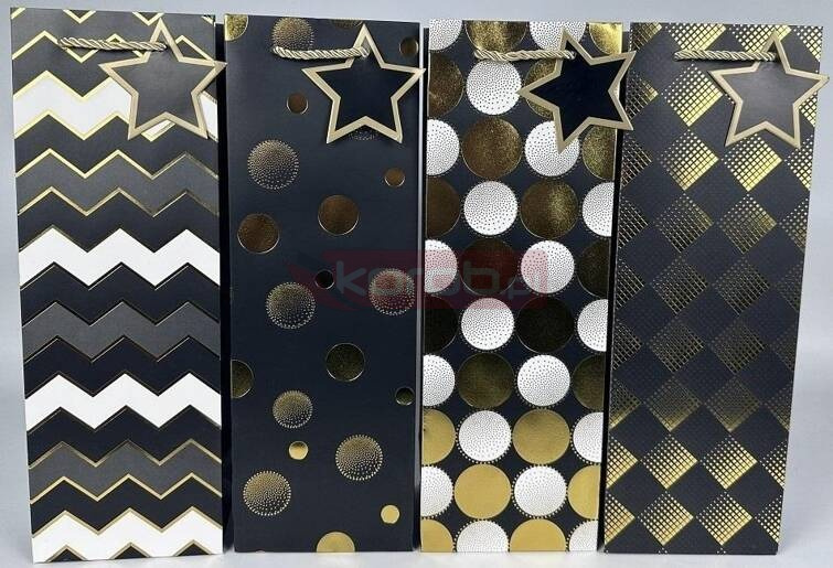 Torebka prezentowa na butelkę Premium. Materiał karton 210 gr. Złocone elementy ozdobne. Uchwyt ze sznurka.