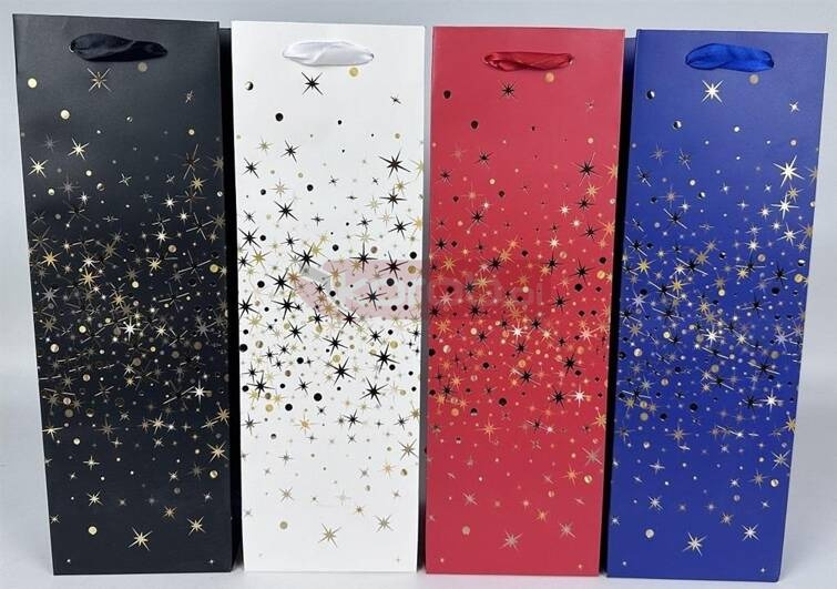 Torebka prezentowa na butelkę Premium. Materiał karton 210 gr. Złocone elementy ozdobne. Uchwyt z tasiemki.