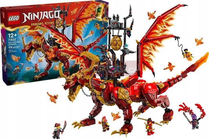 Dzięki temu zestawowi LEGO® NINJAGO® Smoczyca źródła ruchu (71822) dzieci w wieku od 12 lat mogą odtwarzać podniebne przygody z drugiego sezonu serialu NINJAGO® Powstanie Smoków. To największy w historii smok LEGO® z ruchomymi nogami, ogonem, biodrami, szczęką, głową, szyją i dużymi skrzydłami. Całość uzupełnia siodło w kształcie tronu i sześć mniejszych smoków-duchów.