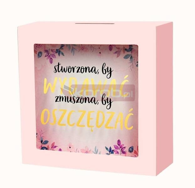 Skarbonka SKARBBOXY SBB-019 Stworzona by wydawać Skarbonka z serii SKARBBOXY to doskonały i niezwykły pomysł na prezent, który idealnie komponuje się w każdym wnętrzu, stanowiąc jednocześnie piękną dekorację. Wykonana z solidnej płyty MDF, skarbonka ta posiada specjalny otwór na górze do wrzucania monet i banknotów. Na szklanej szybce nadrukowany jest ciekawy napis pasujący do różnych okazji, a tło wewnątrz skarbonki zostało starannie zaprojektowane, prezentując przepiękną grafikę, podkreślającą wyjątkowy charakter skarbonki. Dzięki szklanej powierzchni można obserwować, jak skarbonka stopniowo wypełnia się oszczędnościami.. Tył skarbonki jest otwierany, umożliwiając wydobycie zgromadzonych środków na spełnienie jednych marzeń, jednocześnie zachęcając do oszczędzania na kolejne cele. Cechy szczególne: typ: skarbonka do postawienia, wielkość: 16 cm x 16cm, głębokość 5 cm okazja: ogólna