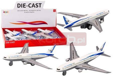 Samolot Pasażerski Napęd Frykcyjny Metalowy Biały Samolot pasażerski to wyjątkowa zabawka, która zachwyca swoim realistycznym wyglądem i solidnym wykonaniem. Zaprojektowany z dbałością o szczegóły, przypomina pełnowymiarowy samolot pasażerski, co sprawia, że dzieci mogą poczuć się jak prawdziwi piloci. Obudowa samolotu jest wykonana z metalu, co zapewnia jego trwałość i odporność na uszkodzenia. Dzięki solidnej konstrukcji, zabawka wytrzyma intensywną zabawę, zarówno w domu, jak i na zewnątrz. Biało-szary kolor dodaje mu elegancji i autentyczności, przyciągając wzrok i wzbudzając zainteresowanie. Jednym z kluczowych atutów tego samolotu jest napęd frykcyjny. To rozwiązanie nie tylko zwiększa realizm zabawy, ale także zachęca do aktywności fizycznej, rozwijając jednocześnie koordynację ręka-oko i zdolności manualne. W opakowaniu zbiorczym znajduje się 6 sztuk. Zabawki sprzedawane osobno. Wymiary samolotu: 13,5cm x 12,5cm x 2,5cm Wymiary opakowania zbiorczego: 39cm x 27,5cm x 5cm Posiada certyfikat CE, ponadto jest zgodny z normą EN71. Przeznaczony dla dzieci powyżej 3 roku życia.Cena za sztukę.