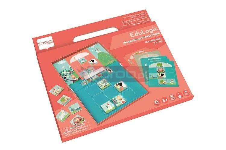 Gra polega na uzupełnieniu obrazka magnesami z księżniczkami, jednorożcami i zamkami. Uwaga: uzupełniane magnesy z obrazkami muszą być zawsze ułożone we właściwy sposób! W zestawie znajduje się 18 różnych kart zadań. Weź kartę zadania i przymocuj ją magnesem do górnej części pudełka Edulogic. Ułóż obrazki z karty zadania z prawidłowymi magnesami na dole. Użyj do tego płytek magnetycznych. Teraz spróbuj wypełnić puste miejsca, prawidłowo znajdując brakujące figurki. Spójrz na rysynkowe podpowiedzi znajdujące się pośrodku pudełka Edulogic. Kto lub co pasuje do siebie? Na przykład księżniczka musi być zawsze umieszczona po lewej stronie żaby (lub żaba po prawej stronie księżniczki), jednorożec musi być umieszczony po lewej stronie karety (lub kareta po prawej stronie jednorożca) i brama zamkowa musi być umieszczona na lewo od zamku lub pod zamkiem. Czy udało Ci się uzupełnić obrazek? Odwróć kartę zadania i sprawdź czy poprawnie wykonałeś zadanie.