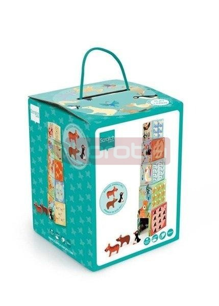 Kolorowa wieża z klocków z pięcioma sześcianami w różnych rozmiarach. Do zestawu dołączone są trzy drewniane zwierzątka: tygrysek, niedźwiadek i pingwinek. Dziecko ma za zadanie ustawić piramidę z 5 kostek kolejno zaczynając od największej tak, aby tworzyła ona logiczny ciąg składający się z obrazków zwierząt morskich, leśnych czy liczb. Oprócz tego dziecko ma możliwość takiego ustawienia kostek poziomo, jedna obok drugiej, aby odpowiednio rozmieszczone ilustracje utworzyły spójny obrazek.
