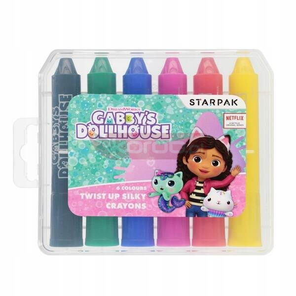 Kredki w sztyfcie z kolekcji Gabyby's Dollhouse to miękkie, wykręcane kredki w intensywnych kolorach, które dają efekt suchej pasteli.