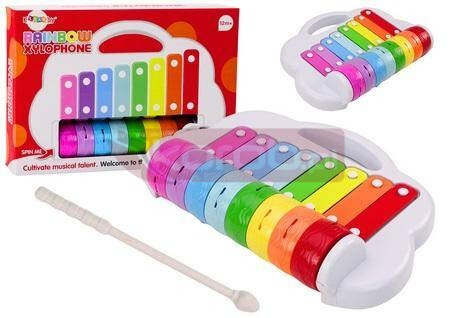 Cymbałki Tęczowe Instrument Dla Dzieci Edukacyjny Interaktywny Kolorowe Cymbałki dla dzieci to wspaniała, kolorowa zabawka muzyczna, która wprowadza maluchy w świat dźwięków i melodii. Zestaw składa się z cymbałków posiadających 8 kolorowych klawiszy, z których każdy wydaje inny dźwięk. Dodatkową atrakcją są dopasowane do klawiszy kółka, które obracają się o 360 stopni i również generują dźwięki odpowiadające poszczególnym klawiszom. Do zestawu dołączona jest pałeczka, która umożliwia dzieciom wygodne i precyzyjne granie na cymbałkach. Cymbałki są umieszczone na stabilnej, białej podstawce z rączką, co pozwala na łatwe przenoszenie zabawki. Dzięki temu dzieci mogą cieszyć się grą w różnych miejscach, zarówno w domu, jak i na świeżym powietrzu. Ta interaktywna zabawka muzyczna rozwija zdolności manualne, koordynację ruchową oraz słuch muzyczny najmłodszych, zapewniając jednocześnie wiele godzin wesołej zabawy. Zabawka łączy w sobie elementy edukacyjne, takie jak nauka kolorów i tonów, z aktywną zabawą, dzięki czemu dostarcza dzieciom wiele radości i wspiera ich wszechstronny rozwój. Wymiary cymbałków: 30 cm x 21 cm x 6 cm Wymiary opakowania: 34 cm x 24 cm x 7 cm Posiada certyfikat CE, ponadto jest zgodny z normą EN71. Przeznaczony dla dzieci od 12 miesiąca życia.