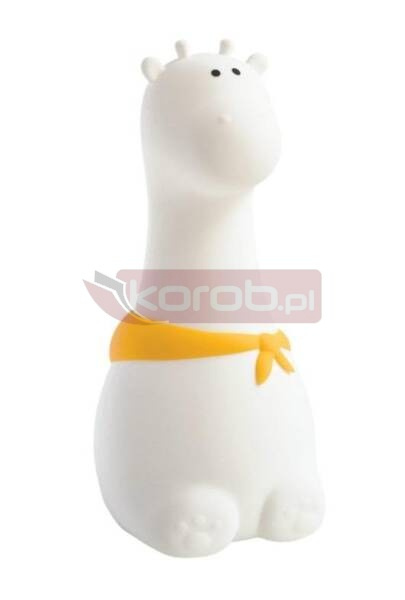 Lampka ŻYRAFA Rabbit & Friends ma charakterystyczny i zabawny kształt małej siedzącej żyrafy z rożkami i sterczącymi uszkami, okrągłymi oczkami, miłym pyszczku i długiej przyozdobionej chustą szyi. Lampka sprawdza się świetnie jako towarzysz wieczornych zabawach wywołując uśmiech na twarzy dziecka. Umożliwia czytanie bajek przed snem jednocześnie zapewniając kojące towarzystwo i spokojny, bezpieczny sen. W godzinach nocnych ułatwia doglądanie najmłodszych pociech, zmianę pieluch i karmienie piersią. Nieco starszych dzieciom posłuży jako przenośne oświetlenie w drodze przez ciemny korytarz do łazienki lub sypialni rodziców. Żyrafa spełnia się jako doskonały przyjaciel w podróży, dzięki ładowaniu za pomocą kabla USB typ C. Lampka jest miękka i przyjemna w dotyku.Posiada trzy chusty w kolorach: żółtym, różowym i niebieskim, które dzieci mogą zakładać na jej długą szyję. Możliwość zmieniania wyglądu żyrafy zachęca do wspólnej zabawy i dostarcza dzieciom wiele radości. Po ściśnięciu, lampka zmienia kształt, by po kilku chwilach wrócić do pierwotnego kształtu. Paleta kolorów lampki stworzy w pomieszczeniu niepowtarzalny, harmonijny, wypełniony miękkim światłem ciepły klimat. Lampka działa na poklepywanie. Dodatkową funkcją jest możliwość ustawienia automatycznego wyłączenia lampki po 2 godzinach. Obsługa lampki jest intuicyjna - nawet małe dziecko poradzi sobie bez problemu. Lampka Rabbit & Friends nie ma ostrych krawędzi ani się nie nagrzewa (dzięki technologii LED). Wykonana jest z wysokiej jakości, certyfikowanego, bezpiecznego, wolnego od BPA, silikonu. Cechy: