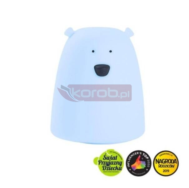 Lampka MIŚ MAŁY Rabbit & Friends ma charakterystyczny i urokliwy kształt misia o niewielkich, sterczących uszkach, przenikliwych oczkach, zgrabnym nosku i okrągłym brzuszku. Jest cała biała, tylko oczka i nosek są czarne. Lampka zapewni kojące towarzystwo w trakcie wieczornych zabaw i spokojny, bezpieczny sen. W godzinach nocnych ułatwia doglądanie najmłodszych pociech, zmianę pieluch i karmienie piersią. Nieco starszych dzieciom posłuży jako przenośne oświetlenie w drodze przez ciemny korytarz do łazienki lub sypialni rodziców. Paleta kolorów lampki stworzy w pomieszczeniu niepowtarzalny, harmonijny, wypełniony miękkim światłem ciepły klimat. Lampka działa na poklepywanie. Dodatkową funkcją jest możliwość ustawienia automatycznego wyłączenia lampki po 1 godzinie. Obsługa lampki jest intuicyjna - nawet małe dziecko poradzi sobie bez problemu. Lampka Rabbit & Friends nie ma ostrych krawędzi ani się nie nagrzewa (dzięki technologii LED). Zasilana jest poprzez baterie: 3 x AAA. Wykonana jest z wysokiej jakości, certyfikowanego, bezpiecznego, wolnego od BPA, silikonu. Lampka została doceniona i otrzymała kilka nagród: XVIII edycji konkursu Świat Przyjazny Dziecku organizowanej przez Komitet Ochrony Praw Dziecka, III edycji plebiscytu Influencers Top 2020 oraz prestiżowego konkursu Zabawka Roku, Nagroda Rodziców 2019 portalu zabawkowicz pl. Cechy: