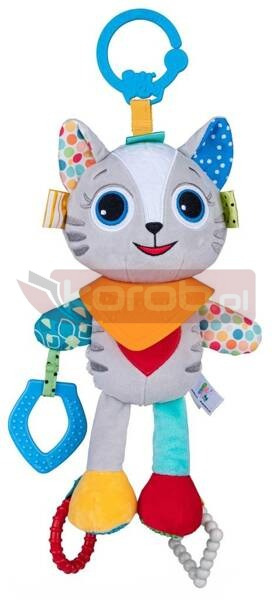 Uroczy kotek to idealny pomocnik w ząbkowaniu. Zwierzak wyposażony jest w twarde oraz miękkie gryzaczki z wypustkami, które podczas gryzienia masują obolałe dziąsła malucha. Dodatkowo, zabawka posiada szeleszczące uszka oraz wykonana jest z materiałów o zróżnicowanych wzorach i fakturach, co stymuluje zmysły dziecka. W brzuszku tego słodkiego kociaka kryje się dodatkowa niespodzianka, dzwoneczek, który rozweseli miłym dla ucha dźwiękiem. Praktyczny uchwyt pozwoli przymocować zawieszkę w dowolnym miejscu, np. przy łóżeczku, wózku czy foteliku.
