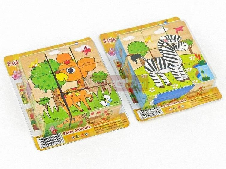 układanka - drewniane klocki z obrazkami 9szt, kwadraty 3,5cm; 15x13x4cm, B/C