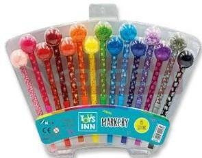 Zestaw 15 mazaków z kolorowymi pomponami. Mazaki mają intensywne barwy i są idealne do rysowania, pisania i kolorowania na papierze