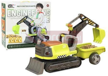 Jeździk Koparka Multifunkcyjna Z Przyczepą Światła Dźwięk Dym Zielona Multifunkcyjna koparka gąsienicowa jeździk to doskonała zabawka dla małych budowniczych, która zapewnia godziny kreatywnej i realistycznej zabawy. Ta imponująca maszyna jest wyposażona w ruchome ramię zakończone pojemną łyżką. Dzięki zaawansowanemu mechanizmowi, ramię koparki porusza się w sposób umożliwiający dokładne i realistyczne operowanie, co sprawia, że dzieci mogą poczuć się jak prawdziwi operatorzy koparek na placu budowy. Podstawa platformy maszyny obraca się wokół własnej osi o 360 stopni, co znacząco ułatwia zabawę i manewrowanie w różnych kierunkach. Ta pełna rotacja pozwala na płynne i efektywne przenoszenie materiałów, bez konieczności przestawiania całej zabawki. Koparka porusza się na kołach ukrytych za realistycznie wyglądającymi gąsienicami, co dodatkowo potęguje wrażenie obcowania z prawdziwą maszyną budowlaną. Ta szczegółowa konstrukcja sprawia, że zabawka nie tylko wygląda imponująco, ale również jest stabilna i łatwa do prowadzenia na różnych powierzchniach, zarówno wewnątrz, jak i na zewnątrz. Z tyłu koparki znajduje się hak, za pomocą którego można podłączyć dołączoną do zestawu dużą przyczepkę. To dodatkowe akcesorium znacząco zwiększa funkcjonalność zabawki, umożliwiając transport materiałów budowlanych z miejsca na miejsce, co jest niezwykle atrakcyjne dla małych budowniczych. Jednym z najbardziej zachwycających elementów tej koparki jest efekt wypuszczania pary wodnej z komina wydechu, tworzący wrażenie dymu. Dziecko może łatwo napełnić zbiorniczek wodą, a następnie uruchomić efekt wypuszczania pary, co dodaje niezwykłego realizmu i wzbogaca całą zabawę. Oprócz efektu dymu, zabawka wyróżnia się działającymi tylnymi światłami oraz efektami dźwiękowymi, które naśladują prawdziwe koparki. Te dodatkowe funkcje sprawiają, że koparka staje się jeszcze bardziej realistyczna i angażująca. Koparka zasilana jest na baterie 3x AA, które nie są elementem zestawu. Wymiary jeździka: 64cm x 57cm x 29cm Wymiary przyczepki: 36cm x 28,5cm x 18cm Wymiary opakowania: 48cm x 48cm x 24,5cm Posiada certyfikat CE, ponadto jest zgodny z normą EN71. Przeznaczony dla dzieci powyżej 3 roku życia.