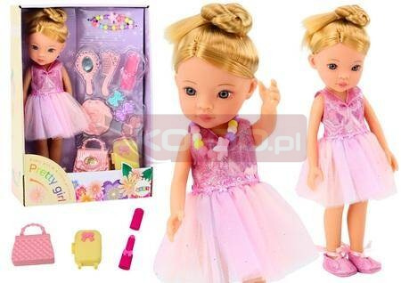 Lalka Baletnica Różowa Balerina Akcesoria Dodatki Sukienka Zestaw Ta urocza lalka baletnica to idealny prezent dla małych miłośniczek baletu i tańca. Lalka zachwyca swoim wyglądem oraz dodatkami, które umożliwiają różnorodną i kreatywną zabawę. Lalka ubrana jest w elegancką, różową sukienkę baletową, która lśni i przyciąga wzrok. Nosi klasyczne baletki, wiązane na nodze, co dodaje jej autentycznego wyglądu prawdziwej baletnicy. Lalka ma długie, blond włosy, uczesane w wysoki kok, co podkreśla jej baletowy styl. Ma delikatny makijaż oraz kolorowy naszyjnik, które dodają jej uroku i elegancji. Stylowa torebka, idealna na drobne akcesoria lalki. Funkcjonalna walizka, którą lalka może zabrać na swoje baletowe podróże. Spinki, które mogą być używane do stylizowania włosów lalki. Mały pierścionek, który dodaje lalce elegancji. Lusterko, szczotkę i lustro poręczne, które pozwala lalce sprawdzać swój wygląd przed baletowymi występami. Lalka baletnica z akcesoriami to świetna zabawka, która nie tylko rozwija wyobraźnię, ale także pozwala dzieciom na odgrywanie różnych scenek i tworzenie własnych historii baletowych. Dzięki różnorodnym akcesoriom, zabawa staje się jeszcze bardziej fascynująca i wszechstronna. Zawartość zestawu: - lalka - walizka - torba - dwie spinki - pierścionek - szminka - dwa lustra - grzebień - oryginalne opakowanie Wymiary lalki: 34 cm x 11 cm x 7 cm Posiada certyfikat CE, ponadto jest zgodny z normą EN71. Przeznaczony dla dzieci powyżej 3 roku życia.