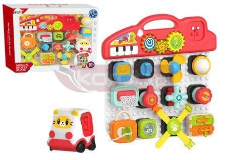 Tablica Sensoryczna Dla Dzieci Panel Edukacyjny Interaktywny Pianinko Wszechstronny i edukacyjny panel sensoryczny dla dzieci, który zapewni mnóstwo radości i rozwijającej zabawy. Ta zabawka to doskonałe narzędzie do stymulacji zmysłów i rozwijania umiejętności manualnych u najmłodszych. Głównym elementem zestawu, do którego można podpiąć różne elementy edukacyjne i sensoryczne jest panel uniwersalny, co pozwala na kreatywne dopasowanie elementów według własnego pomysłu dziecka. Górna część panelu wyposażona w praktyczną rączkę transportową, ułatwiającą przenoszenie zabawki. Znajdują się tu również 4 klawisze pianinka, które wydają wesołe dźwięki i melodie, stymulując zmysł słuchu i zachęcając do interakcji. Zestaw zawiera kolorowe i interesujące części, które można obracać, przekręcać, wciskać, kręcić i otwierać. Elementy te różnią się kształtem, teksturą i kolorami, co dodatkowo przyciąga uwagę dziecka i rozwija jego zdolności poznawcze. Urocze autko, do którego można przymocować ciekawe elementy z zestawu. Autko jest kolorowe i ozdobione różnymi wzorami, co dodatkowo zachęca do zabawy. Zabawka jest bardzo kolorowa, z różnorodnymi wzorami, co przyciąga wzrok dziecka i zachęca do aktywnej zabawy. Wszystkie elementy zestawu są wykonane z bezpiecznych dla dzieci materiałów, zapewniając pełną ochronę podczas zabawy. Panel sensoryczny pomaga w rozwijaniu zdolności manualnych, koordynacji ręka-oko, a także stymuluje zmysły dziecka (wzrok, dotyk, słuch). Ten panel sensoryczny to doskonałe narzędzie do zabawy w domu, przedszkolu czy podczas podróży. Jest idealny na prezent dla każdego malucha, który z pewnością pokocha różnorodność elementów i możliwości, jakie oferuje ta zabawka. Wymiary białej podstawy panelu: 33 cm x 25 cm Wymiary opakowania: 44 cm x 35 cm x 10 cm Panel zasilany na dwie baterie 1.5V AA, które nie są elementem zestawu. Posiada certyfikat CE, ponadto jest zgodny z normą EN71. Przeznaczony dla dzieci powyżej 18 miesiąca życia.