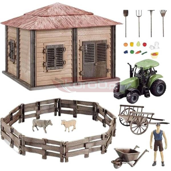 Traktor to niezbędny sprzęt na farmie. Dziecko może nim przewozić zwierzęta, przyczepiać wózek budowalny i wykonywać różne prace rolnicze. Zestaw zawiera narzędzia rolnicze, takie jak łopata, widły i grabie. Dzięki nim można pomóc w pracach na farmie i utrzymać ją w doskonałym stanie. Oprócz tego na farmie znajdują się taczki, wózek.
