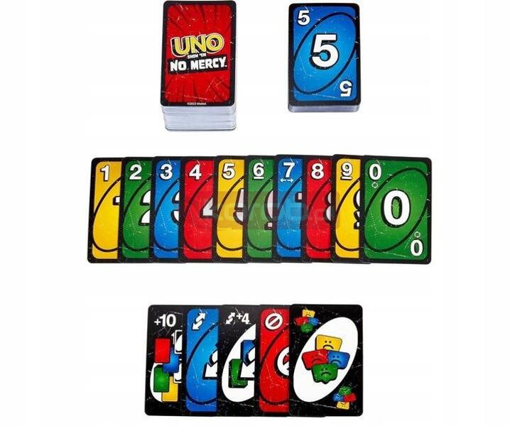 UNO No Mercy Bez litości ma 56 dodatkowych kart, reguły specjalne i bardzo surowe karty specjalne, które razem tworzą najbardziej zaciekłą rozgrywkę UNO w dziejach. Trudniejsze karty specjalne, takie jak „Postój dla wszystkich”, dzika karta „Weź sześć”, a nawet dzika karta „Weź dziesięć” sprawiają, że w tej grze nikt nie bierze jeńców. Reguła sumowania pozwala przenieść karę (Weź dwie/cztery/sześć/dziesięć) na innego gracza – jeśli ktoś nie może się obronić, musi wziąć wszystkie karty! Jeśli wyłożona zostanie karta „7” lub „0”, gracze muszą zamienić się taliami z inną osobą. Reguła „Litości”: gdy gracz zbierze 25 kart lub więcej, wypada z gry! Więcej kart to więcej szans, by okazać przeciwnikom zero litości. To doskonały prezent podkręcający akcję podczas wieczoru gier z rodziną lub przyjaciółmi, imprez i podróży.