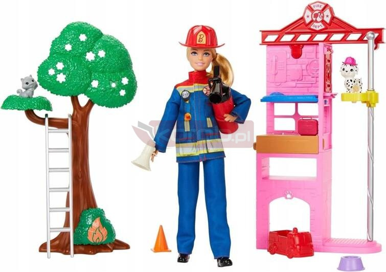 Lalka i zestaw Barbie Strażak inspiruje dzieci do spełniania swoich marzeń dzięki remizie strażackiej, lalce, szczeniaczkowi i ponad 10 elementom do zabawy w odgrywanie ról! Remiza strażacka pobudza wyobraźnię. Lojalny dalmatyńczyk może zjechać po rurze i przedostać się ze swojego legowiska do miniwozu strażackiego! Młodzi poszukiwacze przygód mogą sobie wyobrazić wspaniałe historie o życiu strażaka ze zmieniającym kolor ogniem, który można wbić w dziury w drzewie. Ogień pali się ciepłą wodą i gaśnie zimną wodą Elementy do opowiadania historii obejmują zabawkę z gaśnicą, drabinę, kartę ogniową, stożek i wiele innych, zapewniających dzieciom niekończącą się zabawę! Lalka Barbie ma na sobie mundur strażacki, który dzieci mogą zdjąć, a także buty i hełm pasujący do jej codziennej pracy. Dzięki tak wielu możliwościom zabawy zestaw Kariera Barbie jest doskonałym prezentem dla dzieci w wieku od 3 lat. Specjalnie dla dzieci, które kochają przygody i lubią pomagać innym!