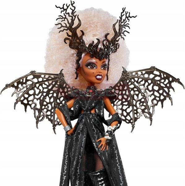 Nadszedł czas! Zaprojektowana we współpracy z niezrównaną RuPaul, ta przerażająca lalka Monster High celebruje wewnętrzny ogień, który czyni każdego wyjątkowym. Ta europejska wersja RuPaul Dragon Queen, ubrana w czarne body ze sztucznej skóry, ma na sobie drapowaną sukienkę wierzchnią ze wzorem błyszczących cierni i winorośli. Sękate nakrycie głowy wieńczy burzę białych loków, uzupełniając odważny makijaż inspirowany smokami i szkarłatny naszyjnik z amuletem. Ta lalka za pomocą oszałamiających skrzydeł przekazuje główną energię smoka. Wyraziste buty w kolorze obsydianowej czerni o wysokim połysku charakteryzują się oszałamiającą łuską i detalami w kształcie szponów. Dwa smoki yin i yang splatają się wokół lewego ramienia, a masywna bransoletka „RuPaul” otacza prawy nadgarstek. Dzięki stojakowi na lalki i wysokiej jakości opakowaniu ta europejska wersja lalki RuPaul Dragon Queen jest niezapomnianym prezentem zarówno dla fanów RuPaul, jak i kolekcjonerów Monster High. Świetny prezent dla fanów Monster High.